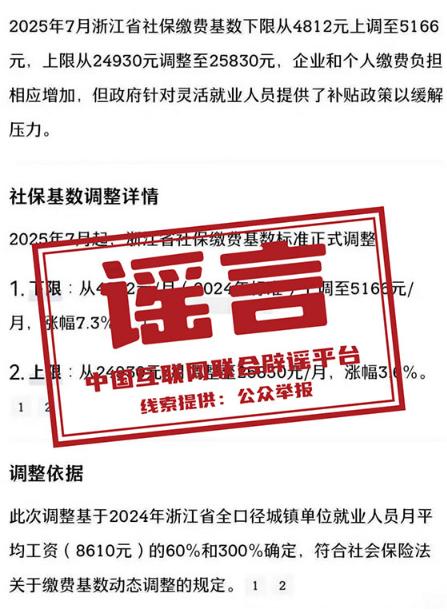真相:近日,“2025年杭州社保基数下限上调至5166元”“2025社保缴费基数调整通知”等相关信息在部分自媒体平台传播。经核查,此为不实信息。杭州市人力社保局相关负责人表示,目前尚未接到上级关于调整今年社保缴费基数的通知,也没有开展缴费基数调整工作,相关信息以官方发布为准,切勿信谣传谣。(来源:“杭州人社”微信公众号)