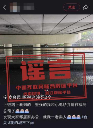 真相:7月30日9时许,某社交平台网民沈某(女,23岁,宁波鄞州人)发帖造谣称“宁波一涵洞内车辆被淹,有3人淹死”。经核查,该内容系谣言,目前公安机关已对沈某依法予以批评教育,该帖文现已删除。