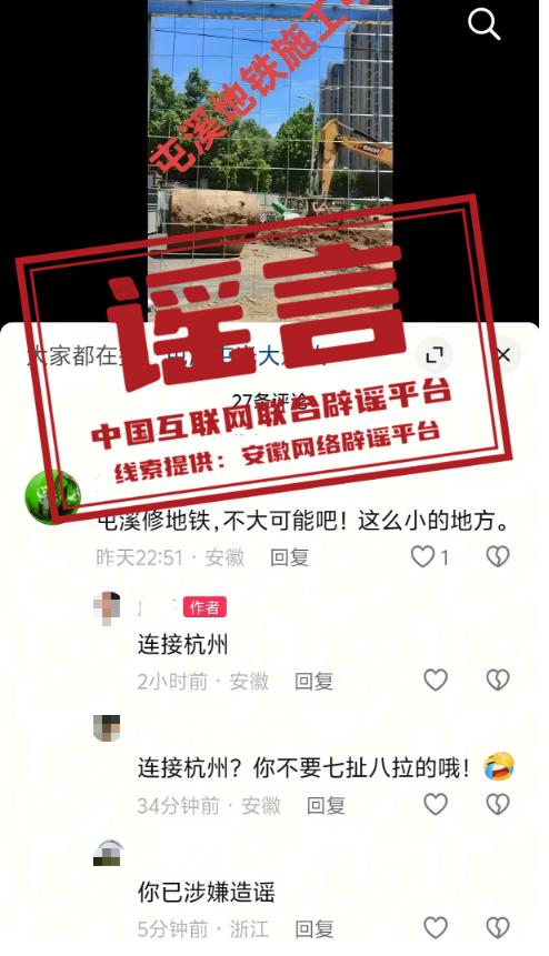 详情:近日,安徽黄山网民王某为博取关注、吸引流量,编造发布“屯溪地铁施工中”视频,在评论区多次跟评宣称“该地铁将连接杭州”。经黄山警方核实,所谓“屯溪地铁施工”及“连接杭州”均为虚假信息。谣言“安徽黄山地铁连接杭州”误导网民,对社会公共秩序造成不良影响。当地公安机关依据相关法律法规对王某作出治安处罚。(来源:“安徽省互联网违法和不良信息举报”微信公众号)