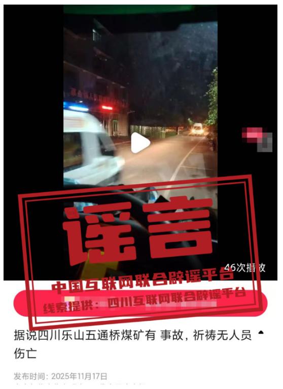 真相:近日,某网络账号在多个社交平台发布视频称“据说四川乐山五通桥煤矿有事故”,引发关注。经当地网信部门核实,该信息系谣言。网传视频是搬运以往旧视频,重新配文后发布,属于旧闻翻炒。请广大网民不造谣、不信谣、不传谣,共同守护清朗网络空间。(来源:四川互联网举报辟谣平台、网信乐山)