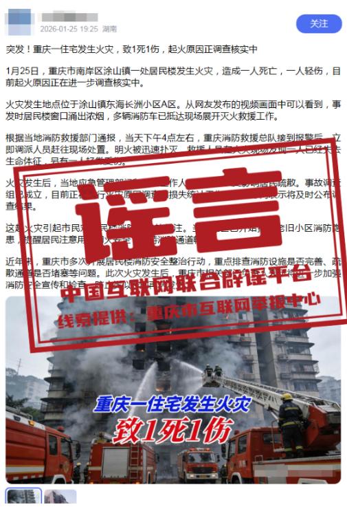真相:1月25日,有网民在互联网发布信息称“重庆市南岸区涂山镇一处居民楼发生火灾,造成一人死亡,一人轻伤”,引发关注。经向南岸区消防部门核实,1月25日南岸区涂山镇未发生火情,网传信息不实。目前,警方正对造谣者展开调查。(来源:“重庆辟谣”微信公众号)