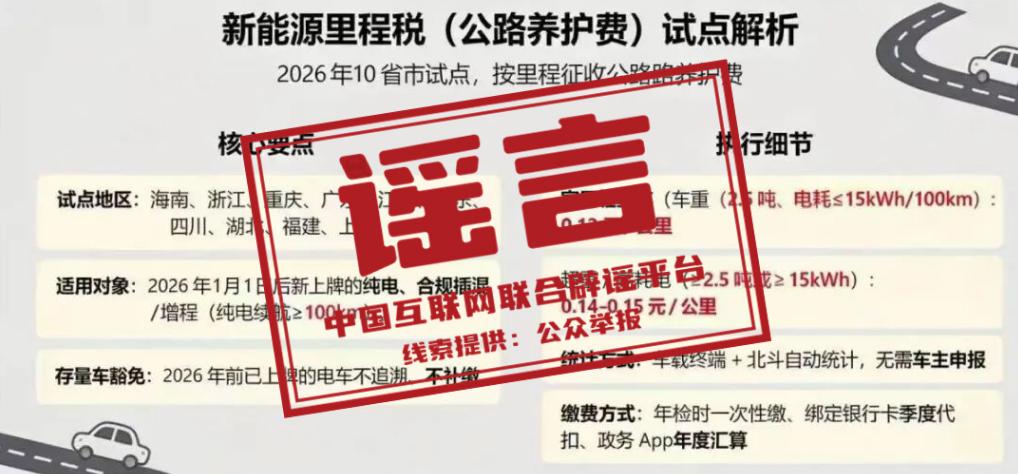 详情:近期,“国内10省市自2026年1月1日起试点开征新能源汽车里程税”的消息在网上流传,因其明确列出试点地区、收费标准与代扣方式等内容,引发关注。对此,封面新闻记者对网传试点的重庆、四川等地进行采访核实,当地税务部门表示“未收到通知”;新能源汽车销售方表示“假的,谣言”,目前新能源汽车实际销售上户过程中,没有收取网传税费;多名汽车行业从业者提醒消费者以正式公告为准,勿被不实信息干扰购车与用车决策。