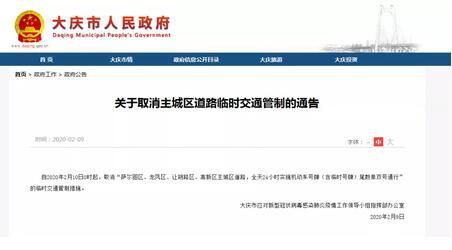 2月9日,大庆市应对新型冠状病毒感染肺炎疫情领导小组指挥部发布公告,自2020年2月10日0时起,取消萨尔图区、龙凤区、让胡路区、高新区主城区道路,全天24小时对机动车实施的单双号通行的临时交通管制措施。