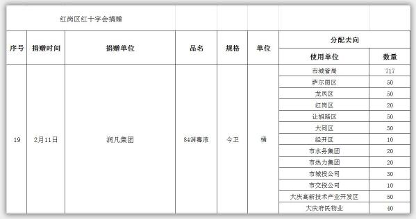大庆市应对新型冠状病毒感染肺炎疫情工作领导小组指挥部办公室物资保障组关于接收市红十字会 市慈善会捐赠物资使用情况的公示