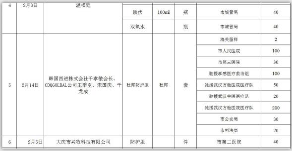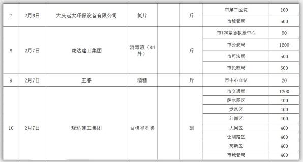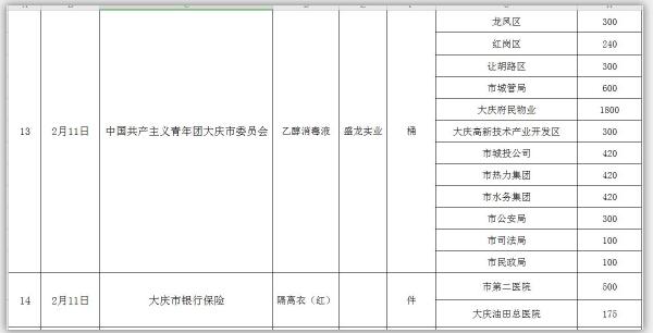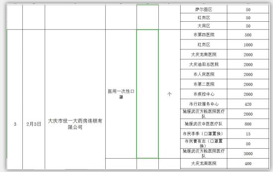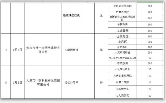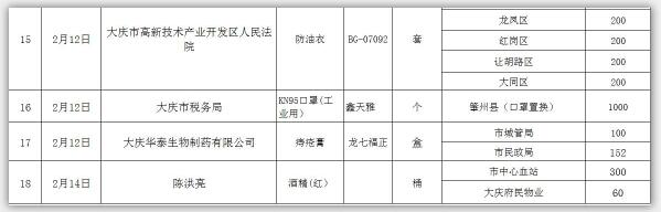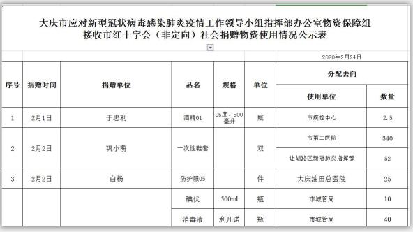 新型冠状病毒感染的肺炎疫情发生以来,社会各界和爱心人士积极捐款捐物,支援全市开展疫情防控阻击战,形成了同舟共济、共同抗“疫”的浓厚氛围。为了全面接受社会监督,现将大庆市红十字会、大庆市慈善会移交市应对新型冠状病毒感染肺炎疫情工作领导小组指挥部统一调配使用的非定向捐赠物资截止到2020年2月23日分配使用情况公示如下:
