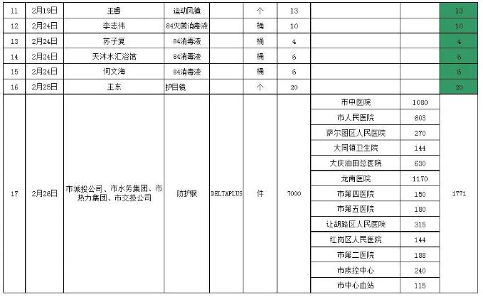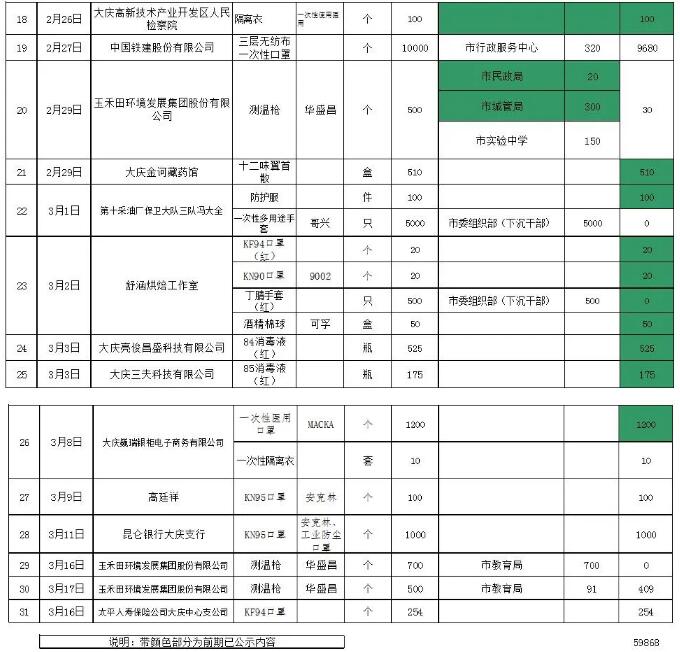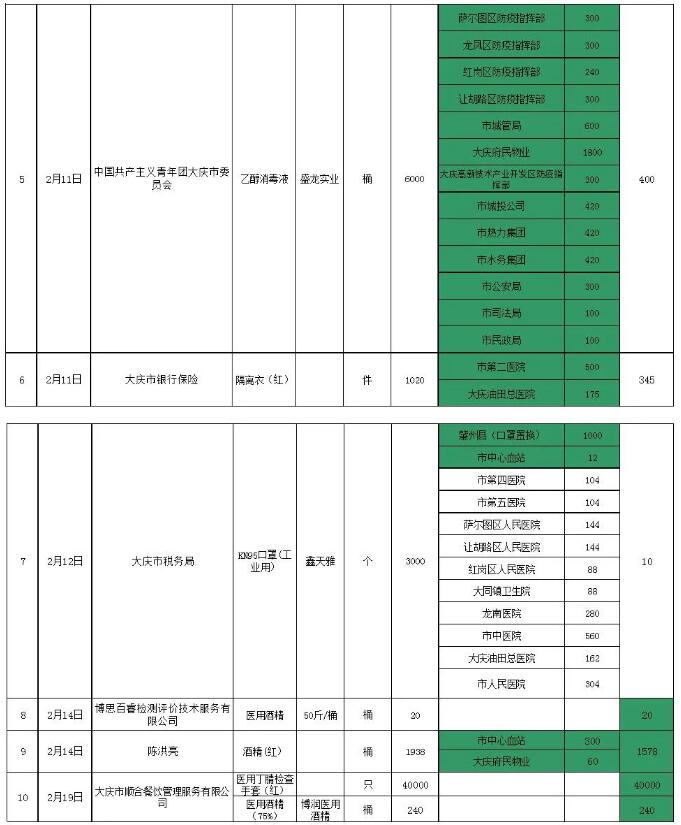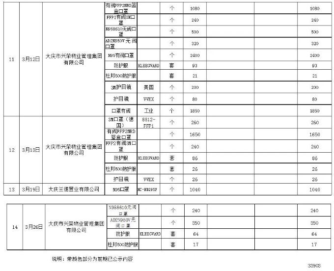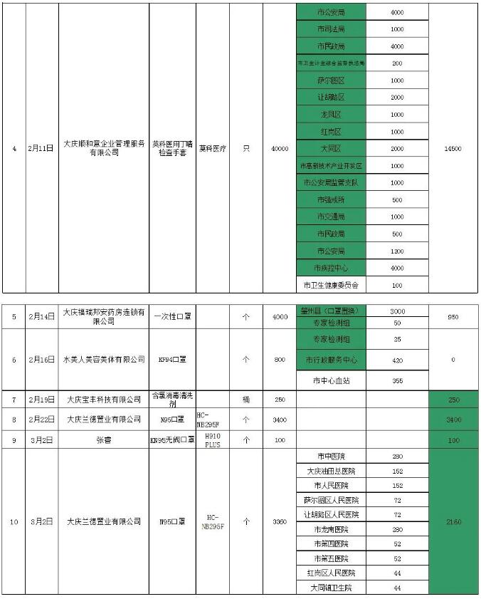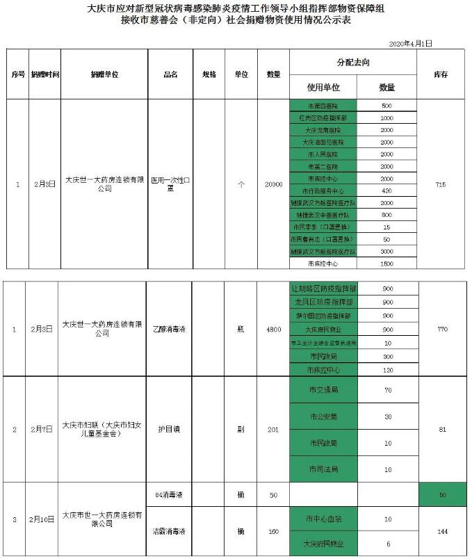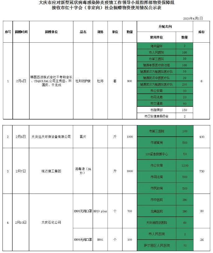 新型冠状病毒感染的肺炎疫情发生以来,社会各界和爱心人士积极捐款捐物,支援全市开展疫情防控阻击战,形成了同舟共济、共同抗“疫”的浓厚氛围。为了全面接受社会监督,现将大庆市红十字会、大庆市慈善会移交市应对新型冠状病毒感染肺炎疫情工作领导小组指挥部统一调配使用的非定向捐赠物资截止到2020年3月31日分配使用情况公示如下: