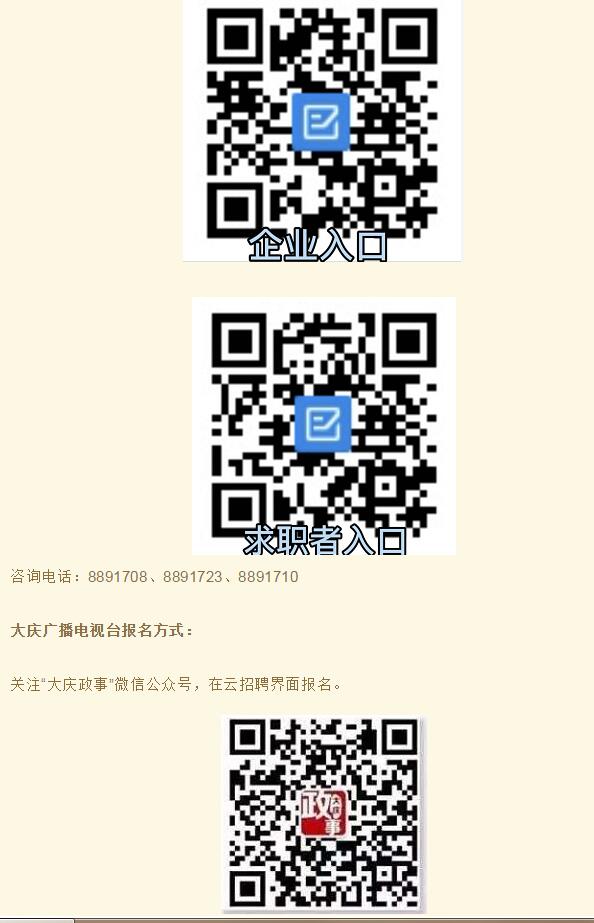 登录“大庆人才网”或关注“大庆市人才服务中心”微信公众号,扫描云招聘会企业入口或者求职者入口二维码报名。