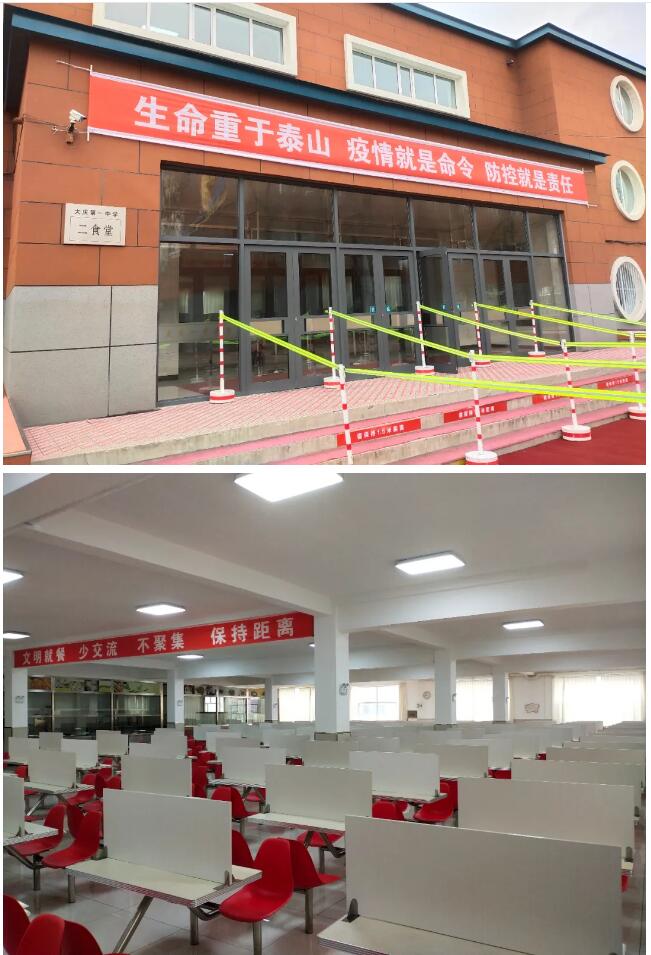记者在大庆一中二食堂外看到,食堂门口被警戒线隔离成4条通道,地面上用黄线提示学生保持1.5米的距离。走进二食堂内,映入眼帘的是一个大条幅,条幅上写有“文明就餐 少交流 不聚餐 保持距离”的字样。食堂餐厅的每张桌上都用木板隔成两个部分。