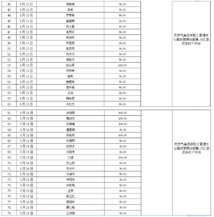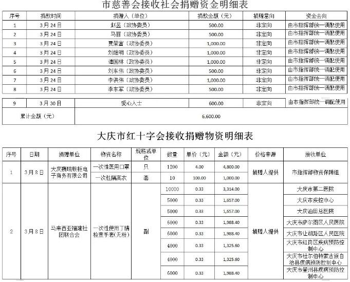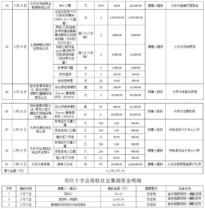 2020年3月7日至2020年3月31日,市红十字会和市慈善会累计直接接收社会捐款94,077.66元,直接接收抗疫物资(简称“物资”)折合人民币6,478,697.40元。其中,市红十字会接收社会捐款87,477.66元,接收物资折合人民币6,138,473.40元。市慈善会接收社会捐款6,600.00元,接收物资折合人民币340,224.00元。新冠肺炎疫情发生以来,市红十字会和市慈善会累计直接接收社会捐赠资金和捐赠物资折合人民币25,624,564.95元。其中,直接接收捐款8,549,046.76元,直接接收物资折合人民币17,075,518.19元。除定向捐赠的款物,市红十字会和市慈善会接收的资金和物资均由市应对新型冠状病毒感染肺炎疫情工作领导小组指挥部统一调配使用。