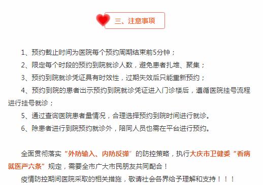 当前,我市外防输入压力持续加大,疫情防控形势严峻复杂,根据市卫健委2020年4月20日发布的大庆市民就医的重要提示(“看病就医严六条”)的有关规定,市民到各级公立医院看病就医全部实行预约入院制度,需提前在“大庆市在线预约到院就诊平台”进行登记预约,在预约时间内,凭预约到院就诊凭证方可进入医院门诊楼,再按医院挂号流程进行挂号就诊!切实达到“错时接诊、减少聚集”的目的。现将预约到院就诊平台使用的有关事项告知如下: