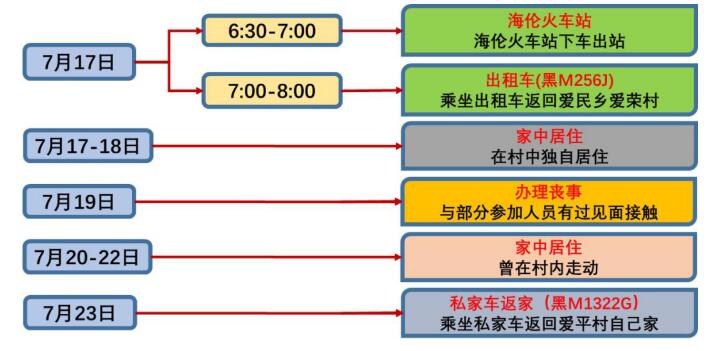 7月16日自大连返回海伦市爱民乡爱荣村弟弟家中。24日,经海伦市人民医院对丁某某新型冠状病毒核酸检测,结果呈弱阳性,后被绥化市第一医院隔离治疗。