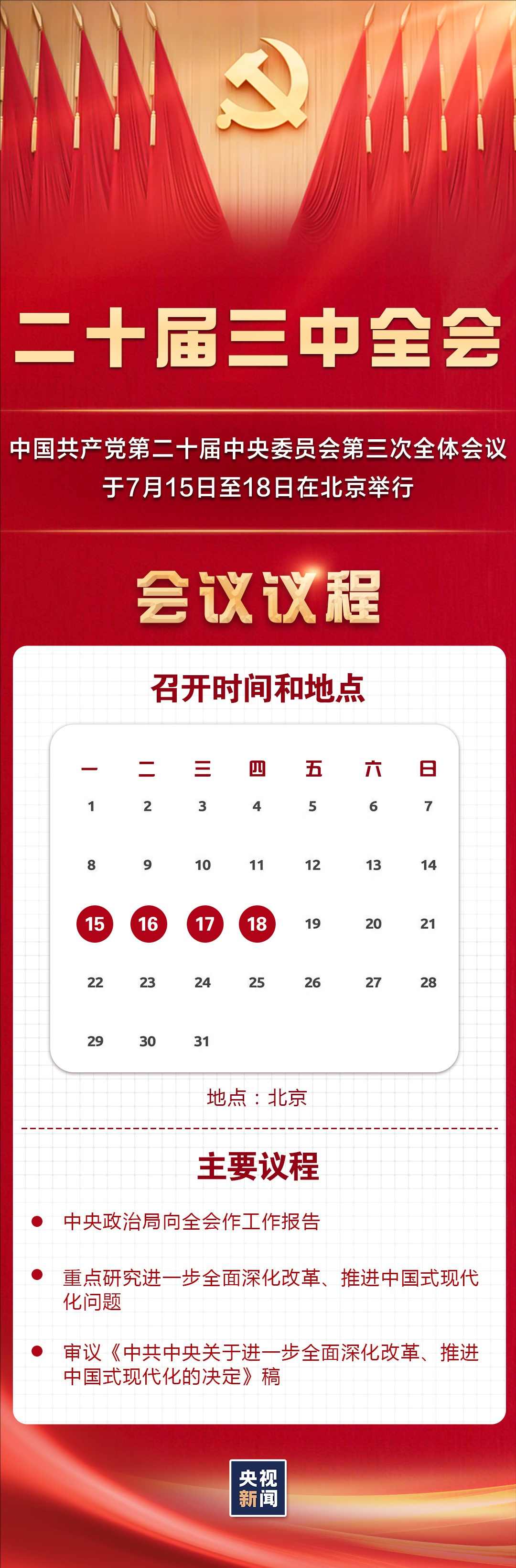 中国共产党第二十届中央委员会第三次全体会议15日上午在北京开始举行。中央委员会总书记习近平代表中央政治局向全会作工作报告,并就《中共中央关于进一步全面深化改革、推进中国式现代化的决定(讨论稿)》向全会作了说明。