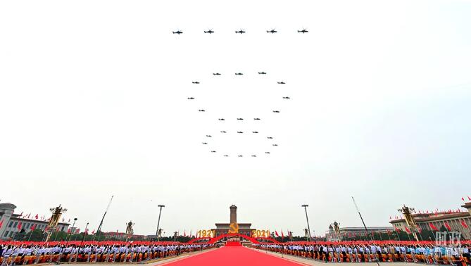 △2021年7月1日,庆祝中国共产党成立100周年大会上,直升机组成“100”字样掠过长空。(总台记者孙楠拍摄)