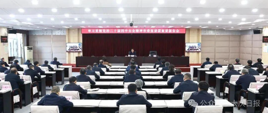 学习贯彻党的二十届四中全会精神市委宣讲团宣讲报告会12月15日举行,市委书记李世峰作宣讲报告。陈宏伟、王艳茹、孙永刚、朱德锋、徐童等出席,罗海涛主持。