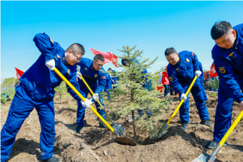 植树现场一派火热劳动景象,“大庆职工义务植树季”暨“大凤带你去种树”第十五季活动同步启动。大家分工协作、默契配合,扶苗、培土、踩实、浇水,新栽的云杉等苗木整齐排列、迎风挺立,为春日松嫩大地增添了勃勃生机。